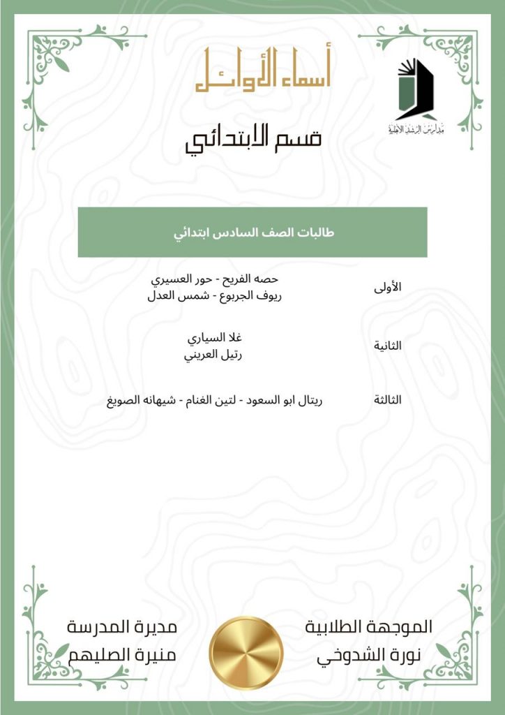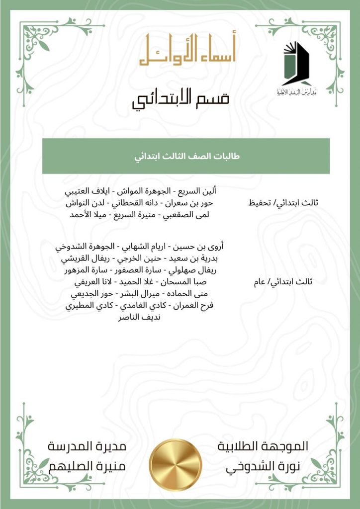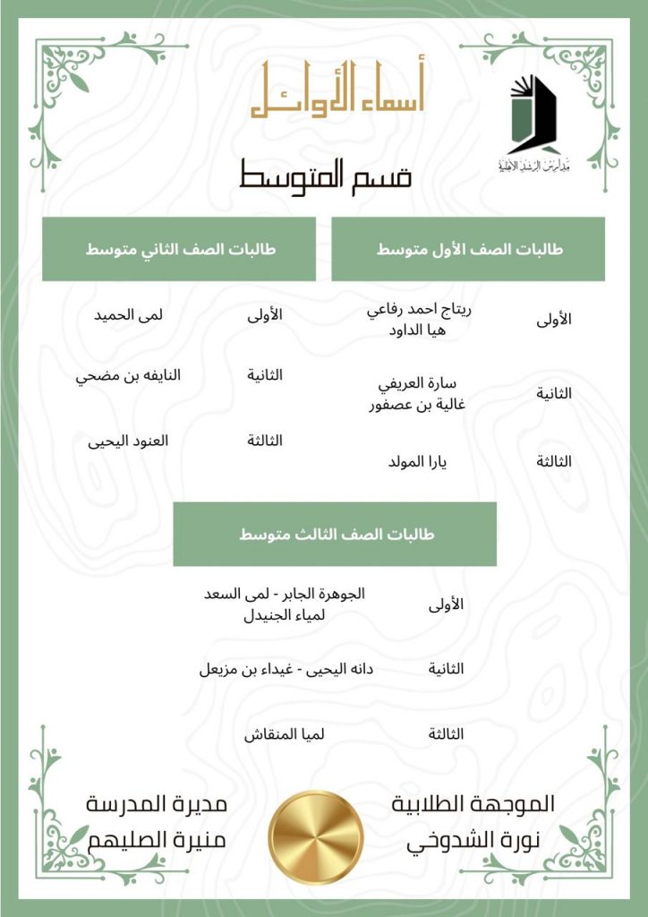 “زرع الأمس هو حصاد اليوم” تعلن مدارس الرشد قسم البنات (الابتدائي/المتوسط) عن الأوائل لجميع المراحل بالفصل الدراسي الثاني وقد كلل بالنجاح والتميز، وتكاتف الجميع من منسوبات المدرسة يدًا بيد مع شركاء النجاح ( أولياء الأمور الأعزاء ). فكل الشكر والتقدير للجهود المبذولة طوال الفصل الدراسي للجميع.
