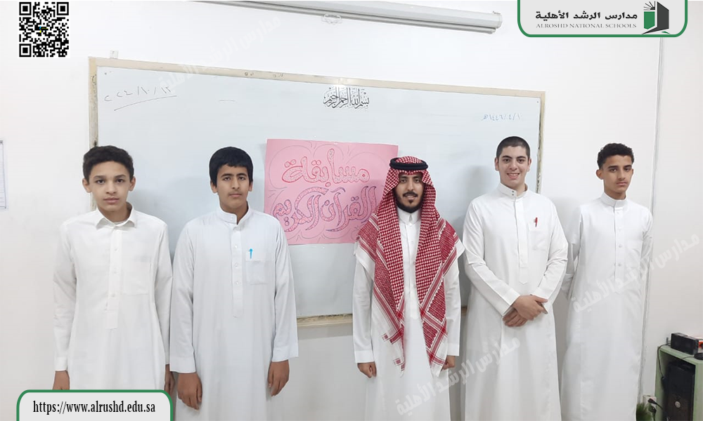 في إطار الأنشطة الدينية والعلمية والثقافية، التي ينظمها النادي الثقافي بثانوية الرشد الأهلية، وتشجيعا للطلاب بالمدرسة على حفظ وتجويد كتاب الله العزيز، أقامت ثانوية الرشد الأهلية قسم ( البنين ) مسابقة قرآنية في حفظ وتجويد القرآن الكريم يوم الأحد الموافق 10 /4 / 1446هـ ، نفذها النادي الثقافي  بالمدرسة برعاية الأستاذ عبد الله التميمي معلم المواد الإسلامية ، والذي استهدف فيه  طلاب الصف الأول والثاني والثالث الثانوي ، اشترك في المسابقة عشرون طالبا ، ووصل إلى المرحلة النهائية أربعة طلاب احتلوا المراكز الأربعة الأولى ، و قد فاز بالمركز الأول الطالب عبد الرحمن الجبرين ، والمركز الثاني الطالب مصطفى الشاطر ، والمركز الثالث الطالب منير الشلبي ، والمركز الرابع الطالب عبد الله الزعاقي .