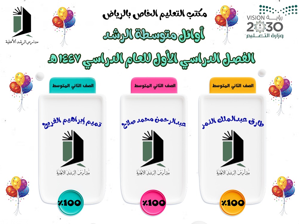 تتشرف متوسطة الرشد الأهلية بنين بأن تعلن عن اعتماد نتائج الاختبارات النهائية للفترة الدراسية الأولى من الفصل الدراسي الأول للعام الدراسي 1447 هـ، وقد أظهرت النتائج تفوقًا وتميزًا من قِبل طلاب المدرسة، مما يعكس جهودهم ومثابرتهم طوال الفصل الدراسي الأول، ويجسد في الوقت ذاته العناية والاهتمام الذي تقدمه إدارة المدرسة والهيئة التعليمية والإشرافية.