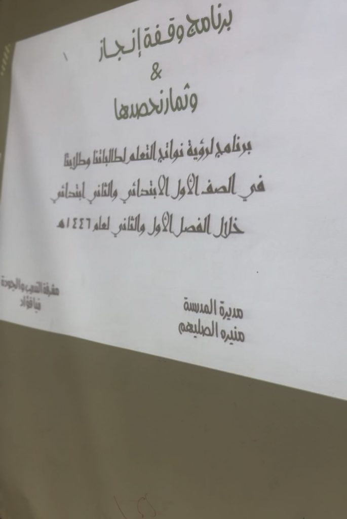 تم يوم الخميس 23 / 7 / 1446 هـ إقامة برنامج وقفة إنجاز وثمار نحصدها لمشاركة أمهات الطالبات والطلاب مخرجات الصفوف الأولية في ( اللغة العربية – الرياضيات – اللغة الإنجليزية ) و وسط اجواء من الفرحة تم تكريم معلمات الصفوف الأولية نظيرًا للجهود التي بذلنها مع الطالبات والطلاب.