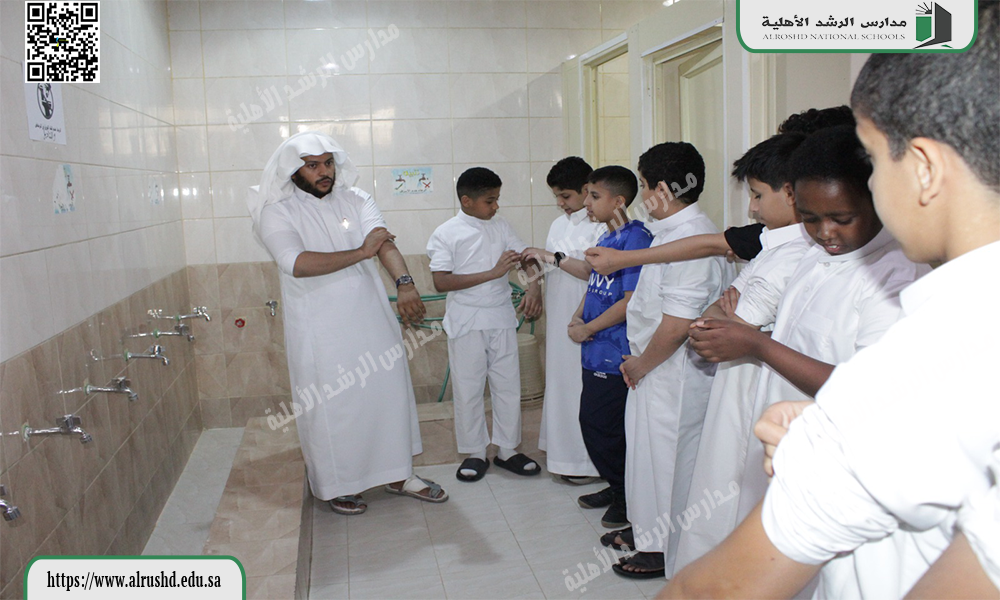 قامت متوسطة الرشد الأهلية باستهداف بعض الطلاب لتعليمهم الوضوء الصحيح من خلال وصف الوضوء وشروط صحته وتعريف الطلاب بنواقض الوضوء كما تم التدريب العملي للوضوء على يد معلم المواد الإسلامية بالمدرسة وشرحه للطلاب كما قام الطلاب بتطبيق ما تعلموه وشاهدوه وكان هناك استجابة متميزة من الطلاب.