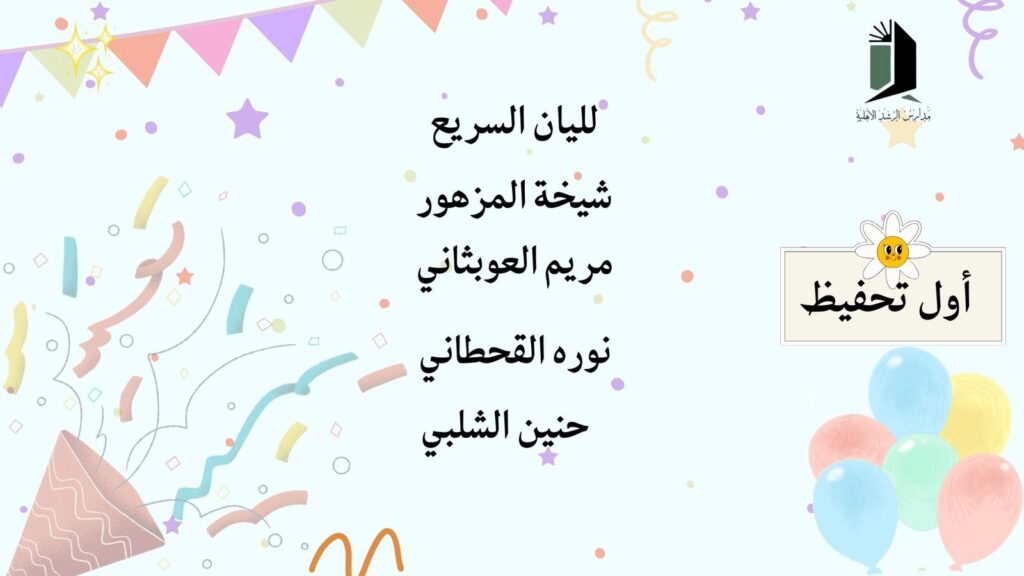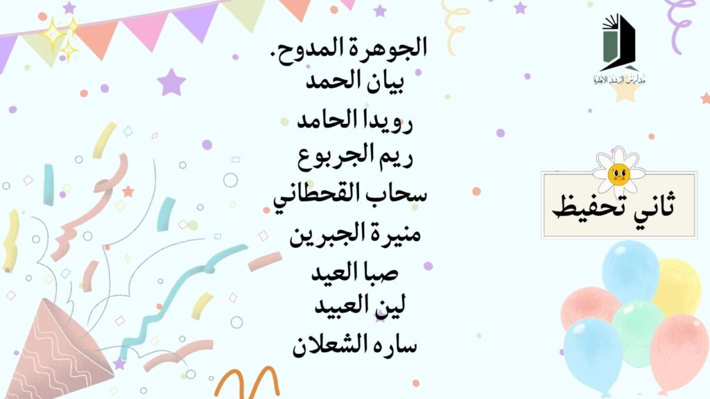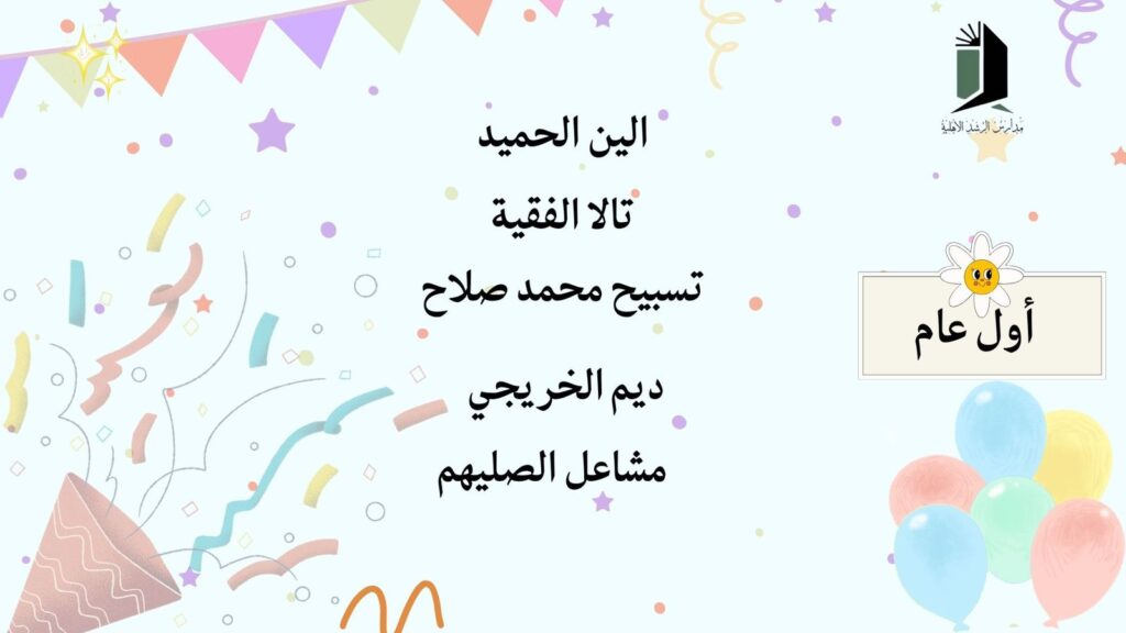 عن أسماء الطالبات المتفوقات بالصفوف الأولية (الصف الأول والثاني)، وذلك تقديرًا لتميّزهن الدراسي، وتفوقهن العلمي، وحصولهن على المراتب المتقدمة بجدٍّ واجتهاد.