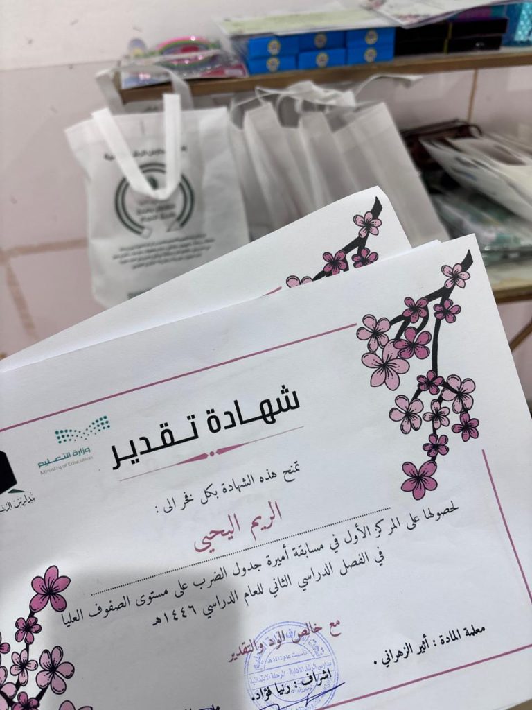 تم يوم الخميس 19 / 10 / 1446 هـ  تكريم الطالبات المتميزات في مادتي العلوم والرياضيات خلال الفصل الدراسي الثاني في البرامج والمسابقات والأنشطة في قسم ( ابتدائي – متوسط ) بنات من قبل  المعلمات أ/ العنود القحطاني ،  أ/ أميرة الحسين ، أ/ أثير الزهراني ، أ/ نفين القحطاني ، أ/ منيرة المطيري ، تحت إشرف المشرفة التعليمية أ/ رنيا فؤاد