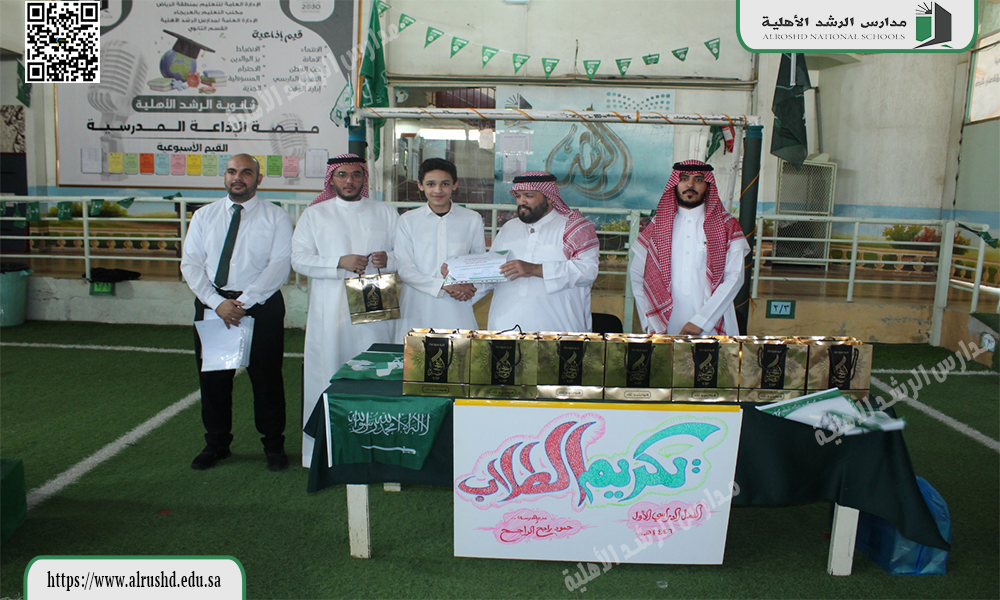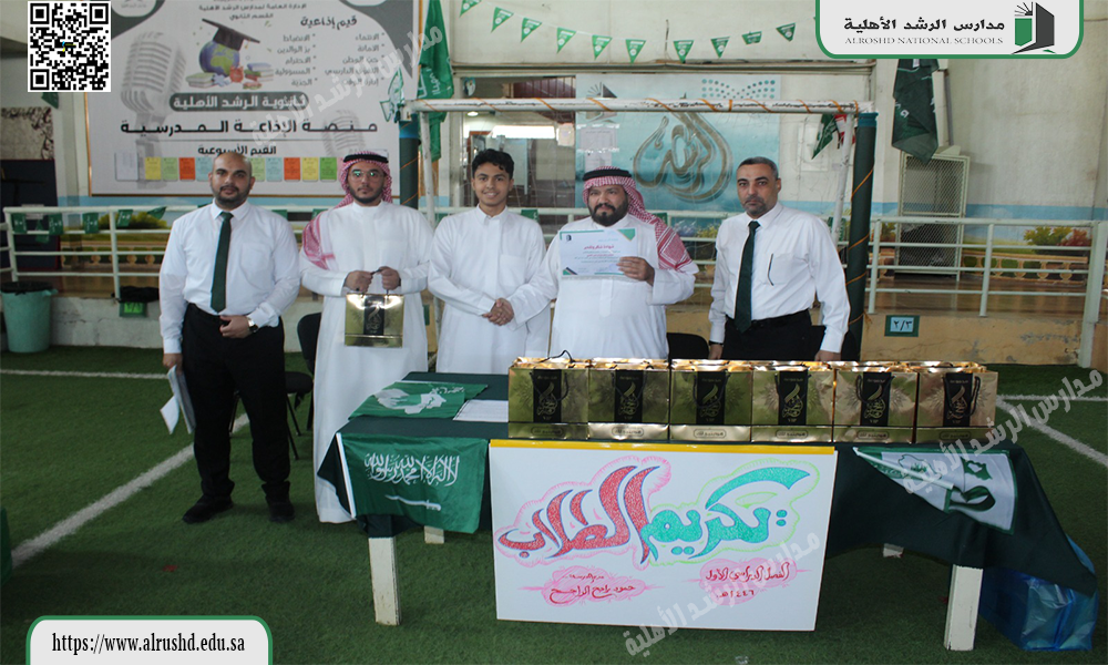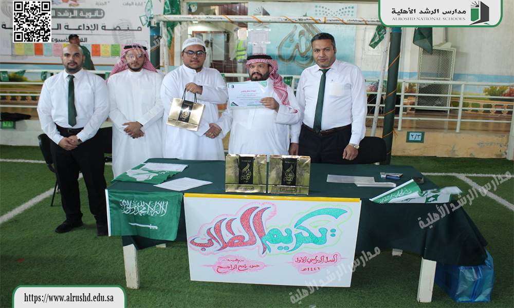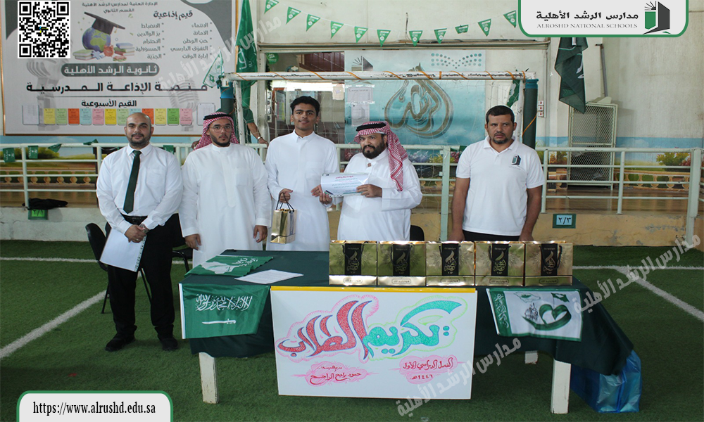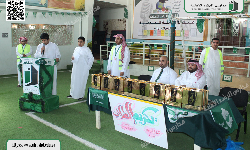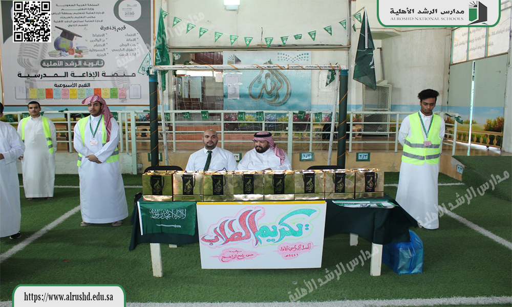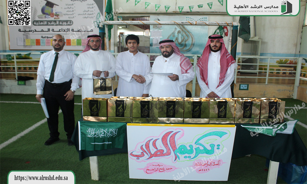 قام النشاط الطلابي بثانوية الرشد الأهلية يوم الثلاثاء الموافق 12 / 4 / 1446 هجرية  بتكريم  الطلاب المتميزين والمتألقين في مشاركاتهم في الأنشطة الطلابية خلال الفصل الدراسي الأول ، وذلك بتقديم الهدايا العينية دعمًا وتأكيدًا على أهمية المشاركات الإيجابية ؛ لتحقيق أهداف الأنشطة الطلابية المستمرة .