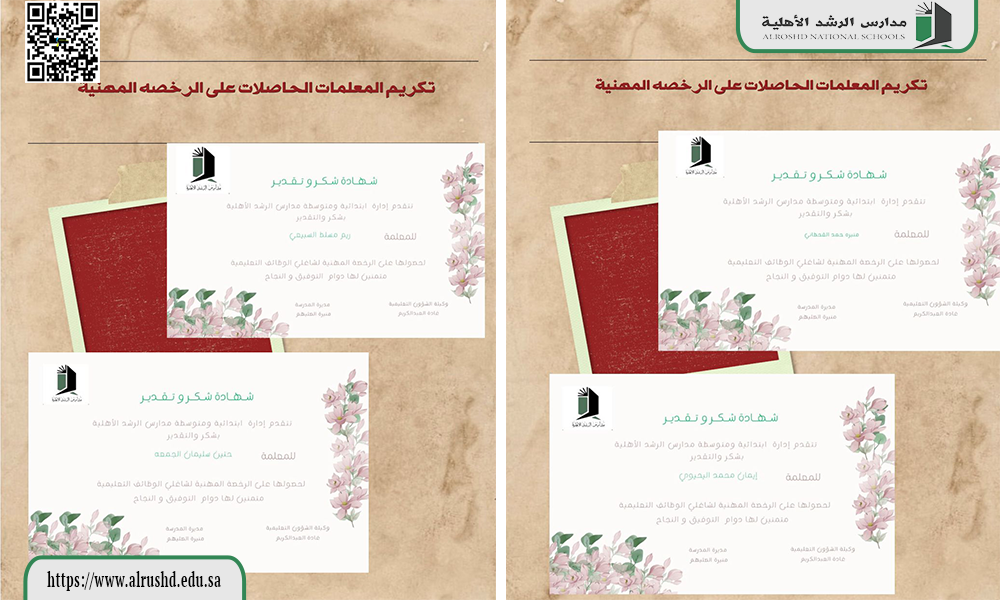 تمَّ يوم الثلاثاء الموافق ١٢ / ٤ / ١٤٤٦هـ تكريم المعلمات الحاصلات على الرخصة المهنية لشاغلي الوظائف التعليمية، بإشراف وكيلة الشؤون التعليمية أ. غادة العبدالكريم، متمنِّين لهن المزيد من التقدم والنجاح.