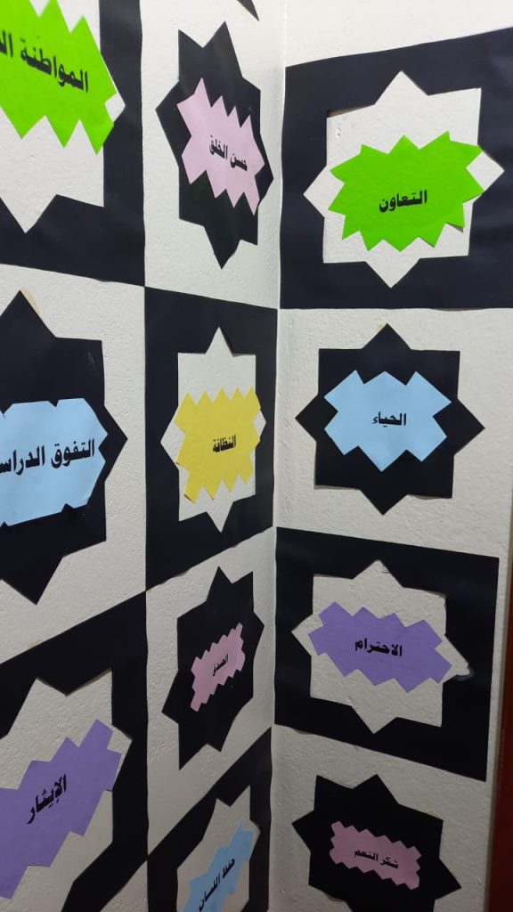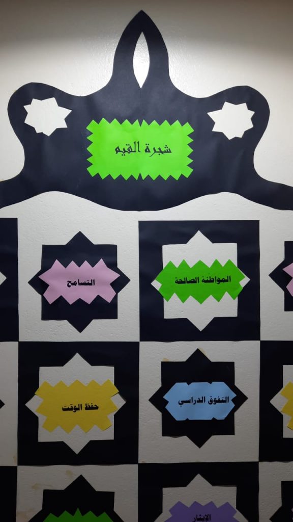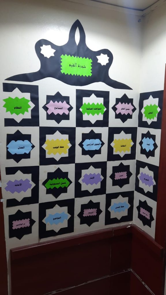 وقد شملت الأنشطة المنفذة تعليق لوحات داخل الفصول وفي الممرات تشير إلى القيمة المستهدفة من خلال آية وحديث وحكمة وقول مأثور يدل على القيمة ، وحلقات نقاشية حول القيم الأخلاقية مثل الأمانة ، الاحترام ، والتعاون وتمارين تفاعلية تعزز مفاهيم القيم ، وعروض تقديمية ومقاطع فيديو تعليمية مرتبطة بالقيم المستهدفة