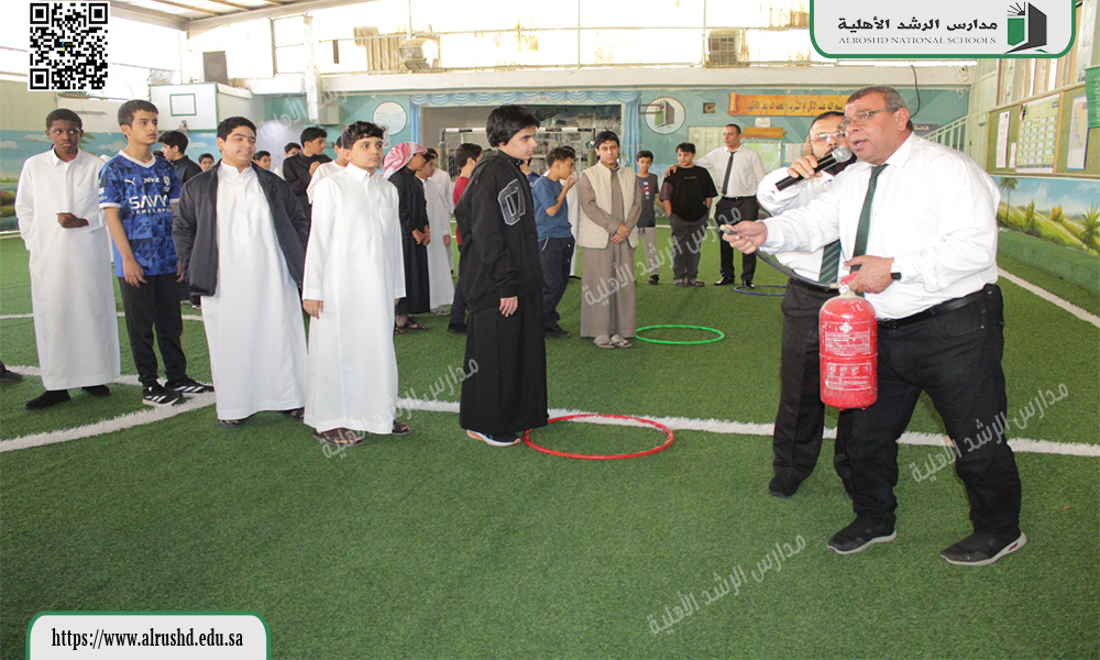 وفقًا لمبادئ الأمن والسلامة بالمؤسسات التعليمية وتنبيه الطلاب لأهمية مراعاة قواعد الأمن والسلامة وتنفيذها للحفاظ على الأرواح والممتلكات تم تنفيذ الإخلاء وتطبيقه وفقًا للخطة الموضوعة كما حث منسق الأمن والسلامة الطلاب على اتباع القواعد المتبعة وكيفية استخدام طفاية الحريق وعدم التدافع أثناء الإخلاء للحفاظ على سلامة الجميع.