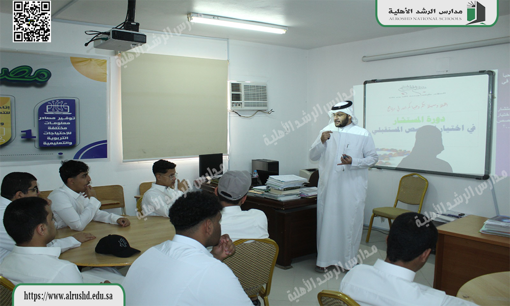 نظّمت ثانوية الرشد الأهلية دورة تدريبية مميزة بعنوان “االمستشار في تحديد المسار المستقبلي” استهدفت طلاب الصف الثالث الثانوي يوم الإثنين الموافق 16 / 10 / 1445هـ ، وذلك بإشراف مباشر من المرشد الطلابي الأستاذ قاسم الفيفي، وبحضور طلاب الصف الثالث الثانوي ، ضمن برامج التوجيه والإرشاد المهني التي تهدف إلى تمكين الطلاب من اتخاذ قرارات مستقبلية واعية حول مساراتهم التعليمية والمهنية.