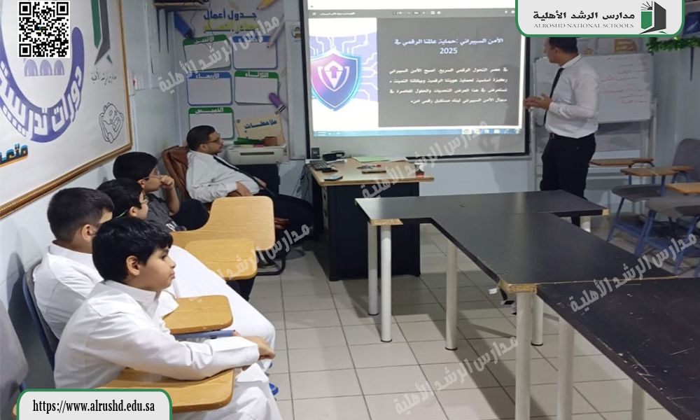 في لقاء مع طلاب ابتدائية الرشد الأهلية بنين ألقى معلم الحاسب الآلي محاضرة بعنوان (الأمن السيبراني) والذى تناول عدة محاور من مفهوم الأمن السيبراني والتخصص فيه وأهمية الاهتمام بهذا المجال وذلك لتأمين العالم الرقمي في عصرنا الحالي من الهجمات الإلكترونية كما تناول اللقاء أنواع التهديدات والهجمات السيبرانية الشائعة بالإضافة إلى سبل الحماية واستراتيجيات الأمن السيبراني الأساسية.