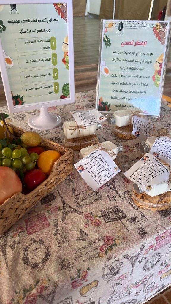 م التوجيه الصحي بالمدرسة بقيادة الأستاذة نوف المطيويع بتفعيل برنامج الإفطار الصحي يوم الأربعاء 15-3-1446ه، هذا وقد أُطلق البرنامج في ساعات الصباح الأولى من خلال فقرات الإذاعة المدرسية ، حيث جسّدت الموجهة الصحية الأستاذة نوف القيمة الغذائية بتوزيع الحليب على الطالبات ، وكانت المدرسة قد أعلنت عن البرنامج تحت شعار (( صحتي في إفطاري )) – أعلنته لأولياء الأمور ليحضر الطالب معه وجبة إفطار صحية منوّعة ، وبفضل الله أسفر البرنامج عن تفاعل الطلاب ، وتناول الوجبات الصحية التي أحضروها معهم .
