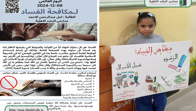 مدارس الرشد سنة واحدة ago تفعيل برنامج اليوم العالمي لمكافحة الفساد بقسم البنات تمَّ يوم الاثنين 8 / 6 / 1446هـ تفعيل البرنامج في الحصة الأولى للطالبات من خلال عرض مقاطع للتوعية بمخاطر